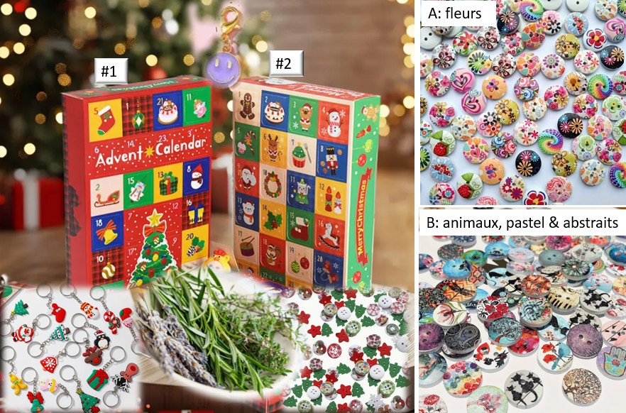 - plein d’autres surprises pour que chaque jour soit différent : 10 boutons à motifs variés utilisés pour vêtements ou bricolage (5 motifs Noël et 5 option A ou B comme dans la photo), 1 porte-clé Noël, 1 porte-clé smiley.